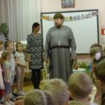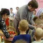 С благословения протоиерея Андрея Турова, настоятеля Свято-Троицкой церкви г. Томска и руководителя отдела религиозного образования и катехизации (ОРОиК) Томской епархии, на праздник были приглашены иерей Максим Темняков, священнослужитель Свято-Троицкой церкви и Арестова Наталья Евгеньевна, работник ОРОиК. Батюшка поздравил всех с Великим праздником, рассказал историю о том, как яйцо покраснело в руках Марии Магдалины и вручил детям подарки.