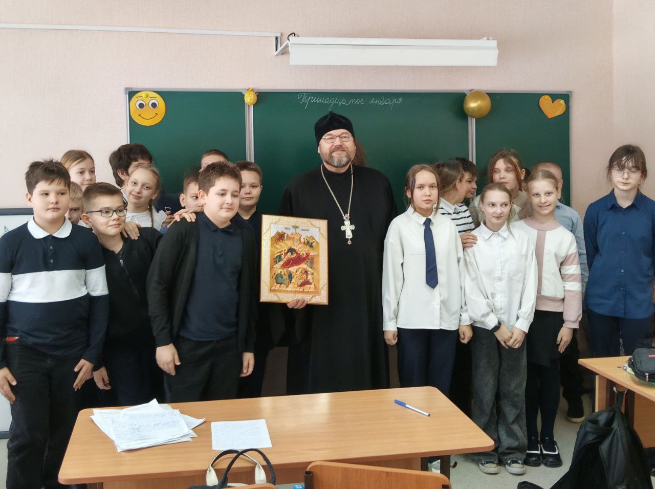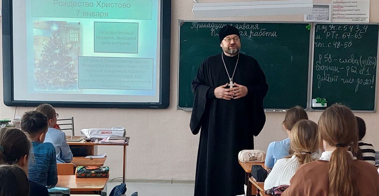 13 января настоятель Свято-Троицкой церкви встретился с учениками МАОУ Гимназия №26. Батюшка рассказал ребятам об истории праздника Рождества Христова, ответил на вопросы и даже пропел колядки.